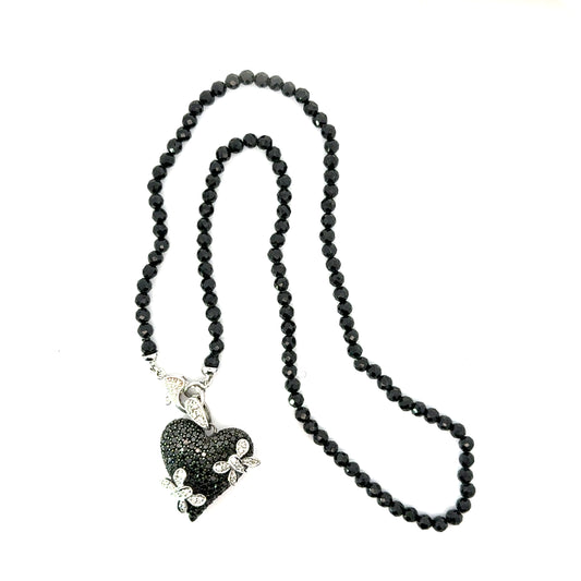 14K White Gold Black Diamond Heart Necklace with Garnet Bead Chain