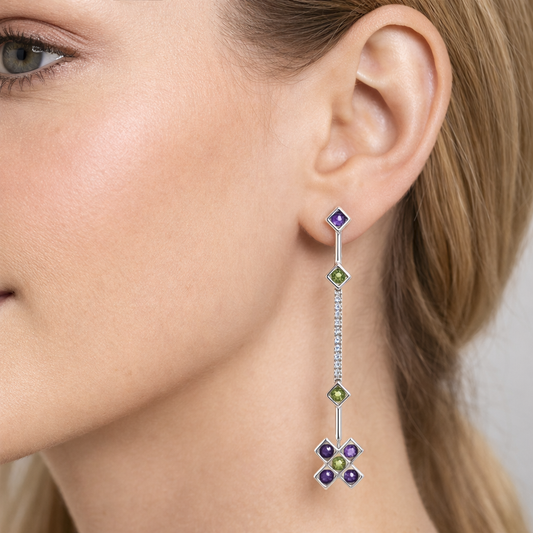 18K White Gold Amethyst, Peridot & Diamond Long Drop Earrings