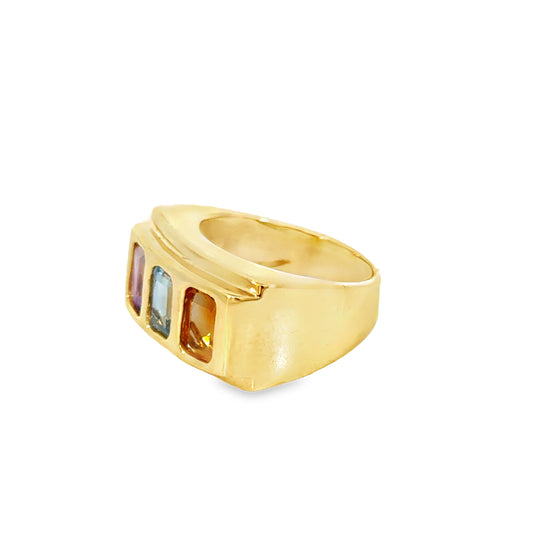 14K Yellow Gold Wide Band Ring with Citrine, Aquamarine & Amethyst