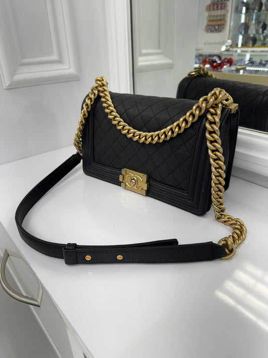 Authentic Chanel Boy Bag in Black Caviar Leather with Aged Gold Hardware