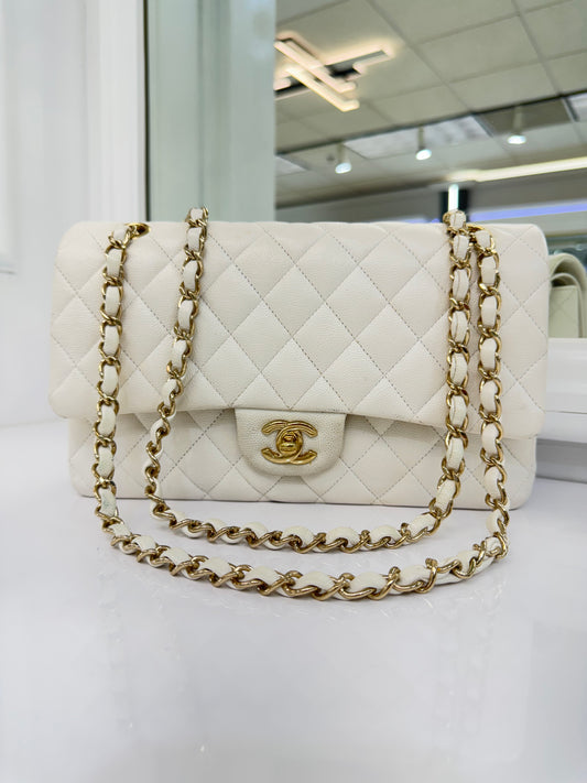 Authentic Chanel Classic Double Flap Bag – White Caviar Leather with Gold Hardware