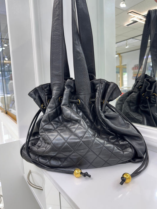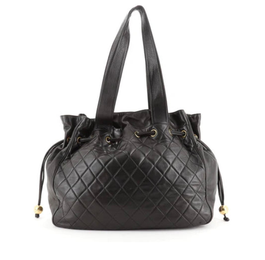Chanel Vintage Quilted Leather Drawstring Tote Bag with Gold CC Charms – Large