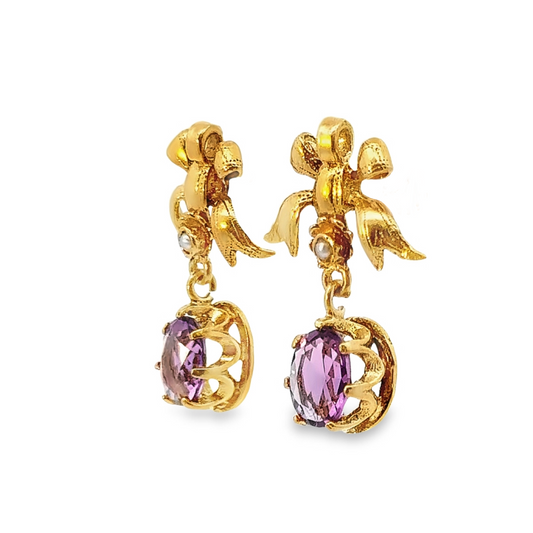 1960's 14K Yellow Gold Ribbon Amethyst & Pearl Earrings