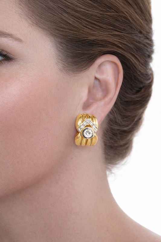 18K Yellow Gold Diamond Textured Half-Hoop Convertible Clip-On Earrings