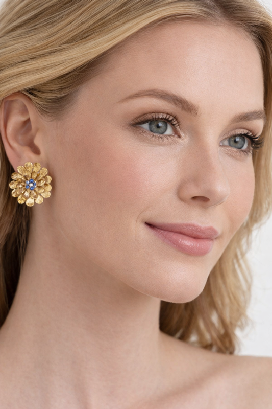 Vintage 18K Yellow Gold Zinnia Flower Earrings with Sapphires & Diamond