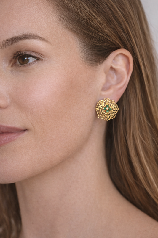 Elegant 18K Gold Openwork Floral Emerald Earrings