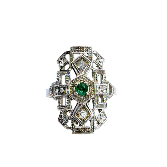 1920s Antique 14K White Gold Emerald & Diamond Filigree Ring