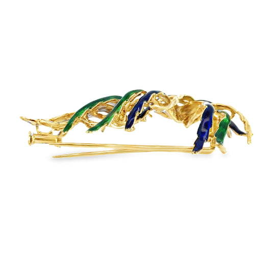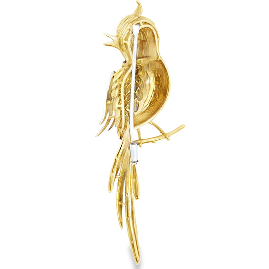 18K Yellow Gold Multi-Color Bird Perched on a Branch Brooch