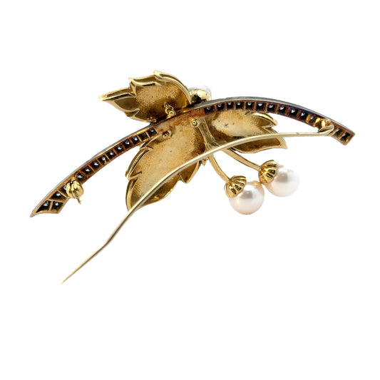 Lovely 18K Yellow Gold Pearl, Diamond & Enamel Leaf & Ladybug Brooch