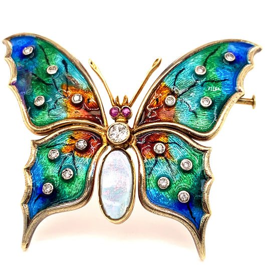 Beautiful 14K Enamel, Opal, and Ruby Butterfly Brooch