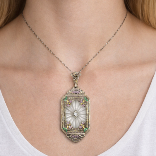 Antique Art Deco 14K White Gold Filigree Rock Crystal Necklace with Enamel & Diamond