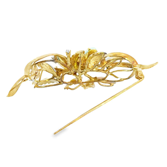 14K Yellow Gold & Opal Flowing Bow Motif Brooch