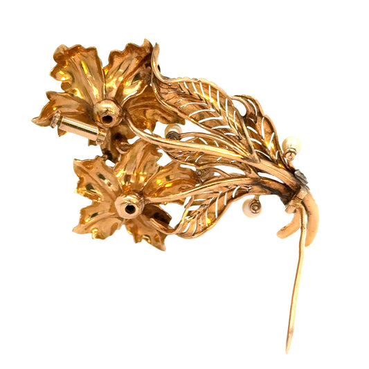 Lovely 18K Yellow Gold Pearl & Diamond Bouquet Brooch