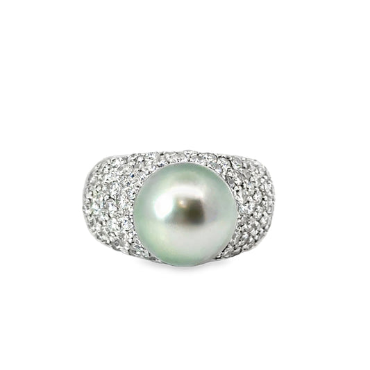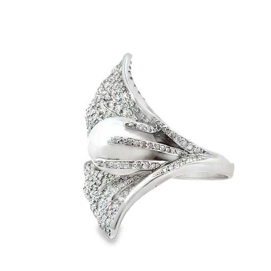 14K White Gold Glamorous 12mm Pearl and Pavé Diamond Couture Ring