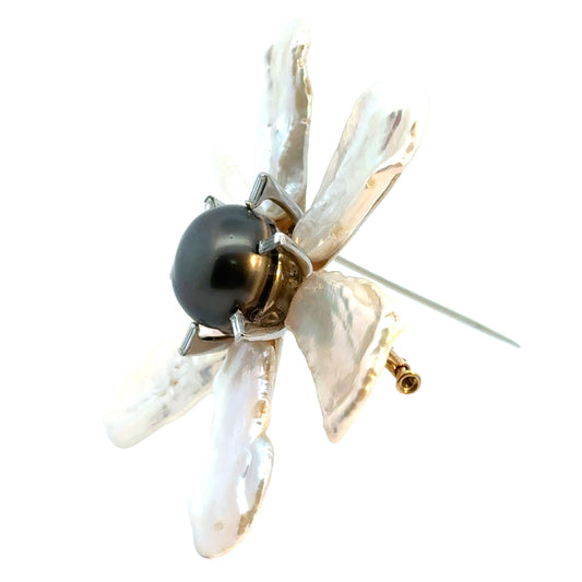 Luxurious 18K Yellow Gold Black & Natural Keshi Pearl & Diamond Brooch