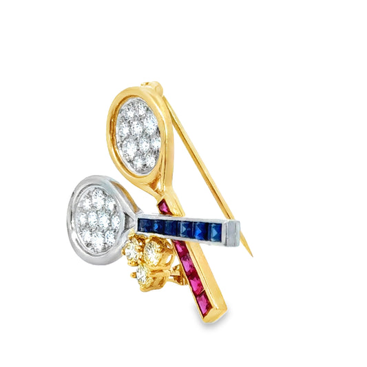 Vintage Heyman Bros. 18K Gold Tennis Pin with Diamonds, Sapphires & Rubies