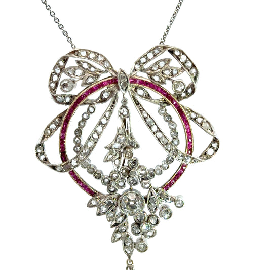Antique Edwardian 14K Gold Diamond, Ruby & Pearl Bow Necklace