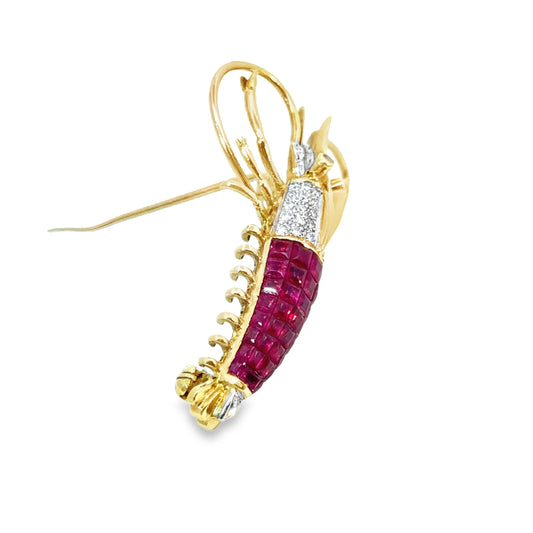 18K Yellow Gold Ruby & Diamond Playful Lobster Brooch