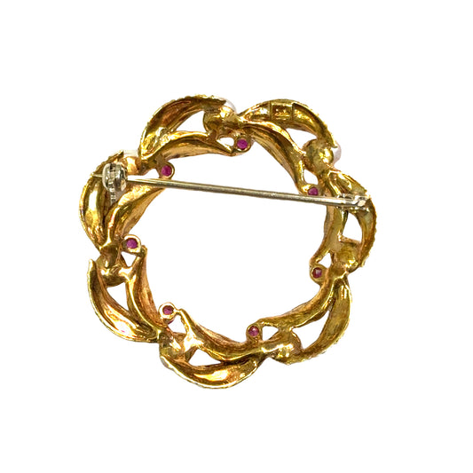 18K Yellow Gold Pearl & Ruby Wreath Brooch