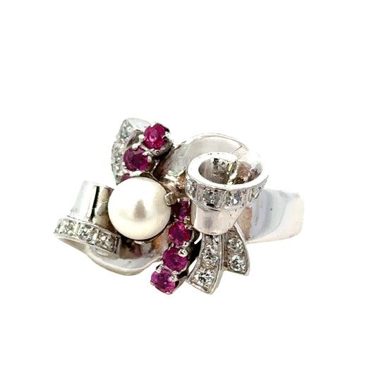 Retro 18K White Gold Ruby, Diamond & Pearl Ribbon Ring – 1950’s Glamour