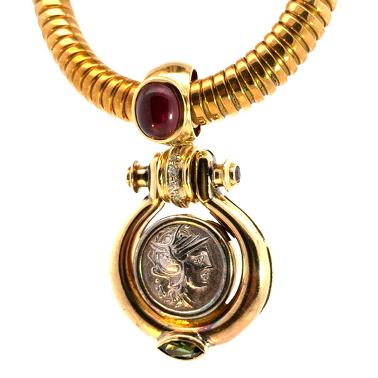 18K Yellow Gold Ancient Coin Necklace with Rubies & Sapphire Accents