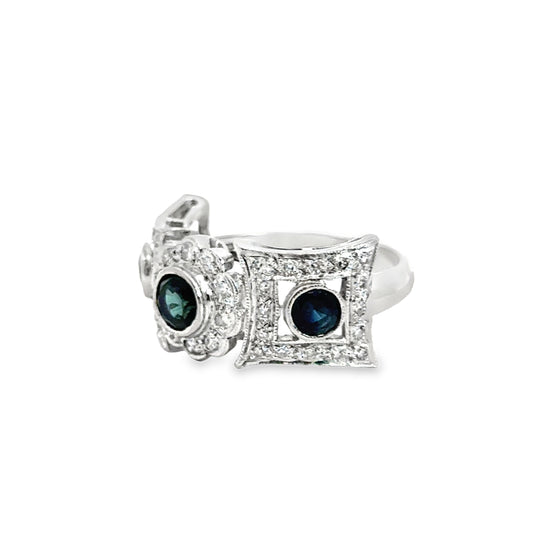 14K White Gold Sapphire & Diamond Ring – Floral & Square Motif Design– Art Deco Style