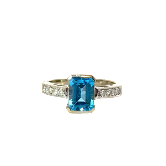 1990s Blue Topaz & Diamond Ring in 14K White Gold