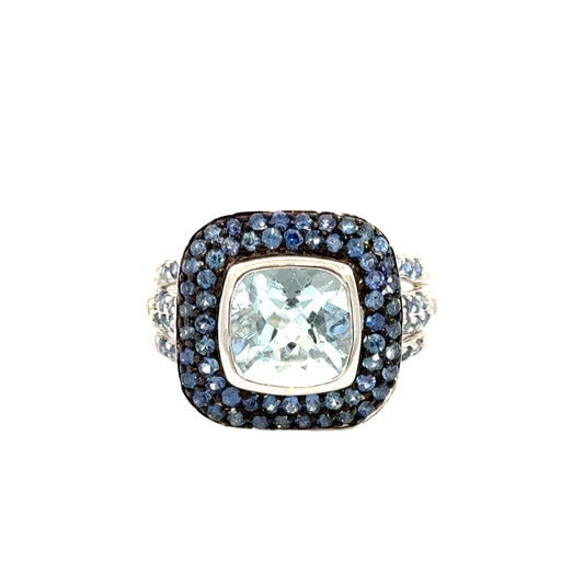 14K White Gold Aquamarine & Sapphire Halo Ring