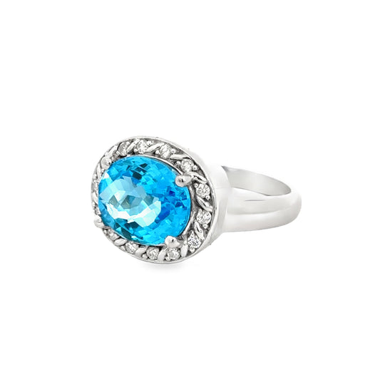 14K White Gold Oval Blue Topaz & Diamond Halo Ring