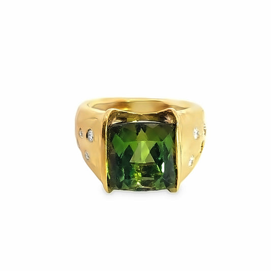 Estate 18K Hammered Yellow Gold Large Green Tourmaline & Diamond Cocktail Ring