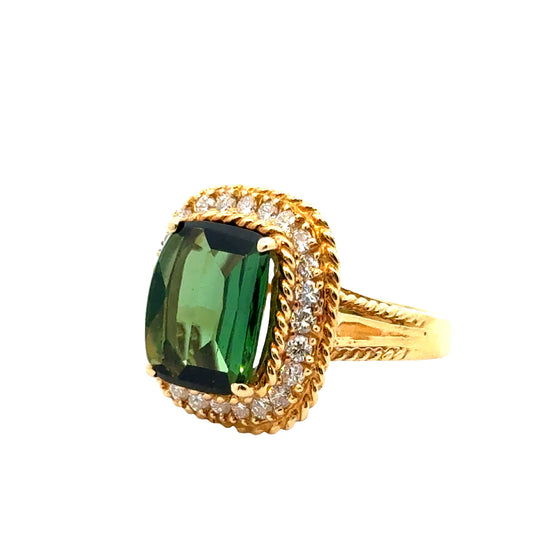 18K Yellow Gold Green Tourmaline & Diamond Rope-Design Ring
