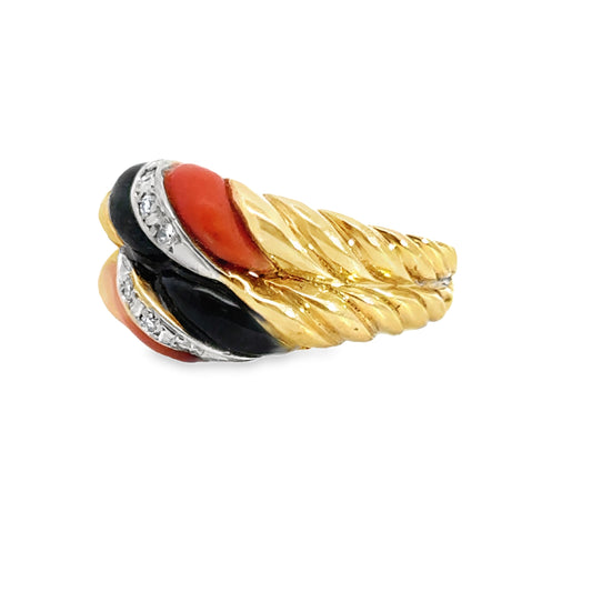 Unique 14K Yellow Gold Coral, Onyx & Diamond Ring