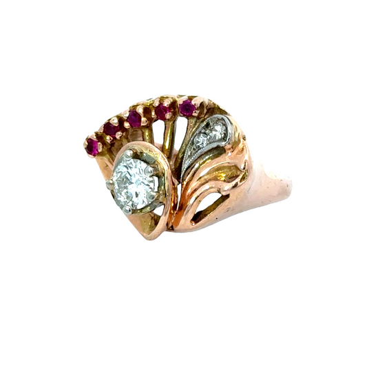 Vintage 14K Rose Gold Fan-Shaped Ruby & Diamond Ring