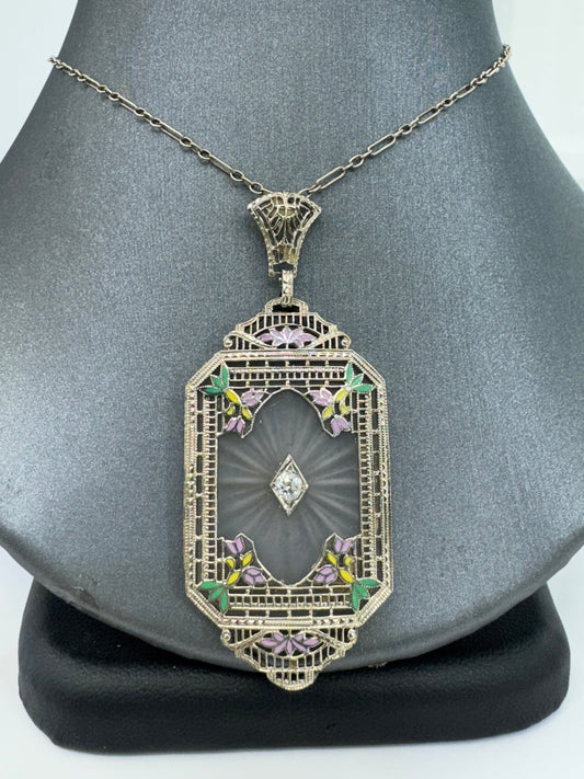 Antique Art Deco 14K White Gold Filigree Rock Crystal Necklace with Enamel & Diamond