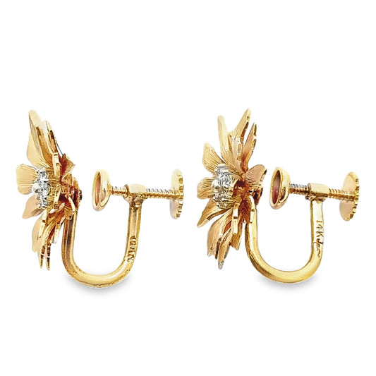 Vintage 14K Yellow Gold Flower & Diamond Screw-Back Earrings