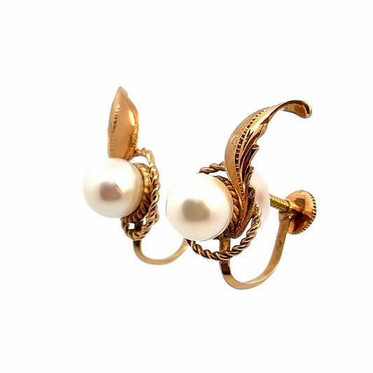 14K Yellow Gold Leaf & Pearl Screw-Back Earrings