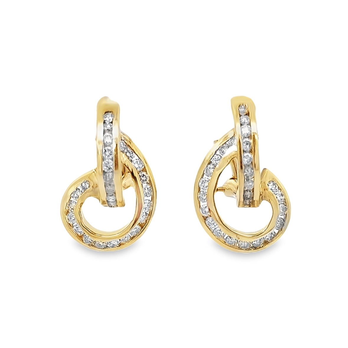 Whimsical swirl design, these earrings feature intertwined loops that create a fun twist with channel set diamonds that catch the light beautifully. A unique and eye-catchy look that would make and elegant and fun addition to any outfit.