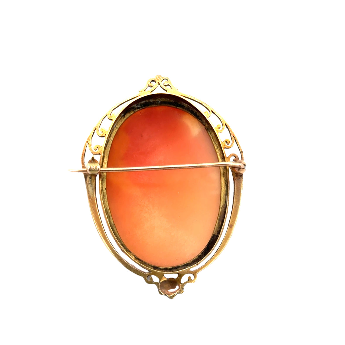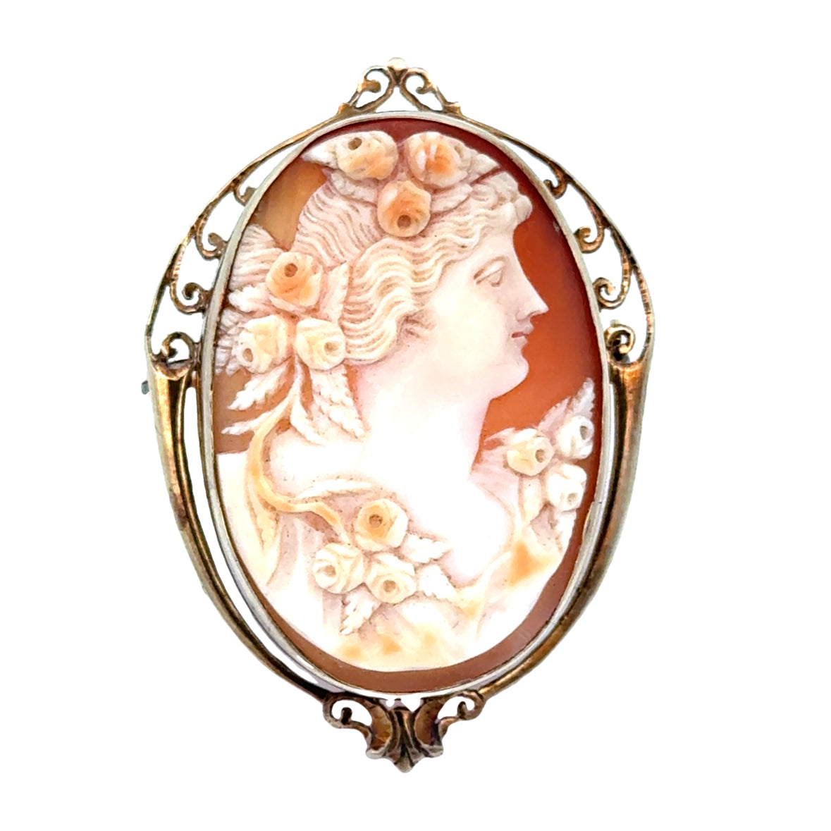 This 1930s yellow gold cameo brooch features an exceptionally detailed hand-carved shell cameo of a woman in profile, adorned with intricately sculpted roses in her hair and draped along her shoulders. The warm orange background contrasts beautifully with the creamy white relief, highlighting the depth and craftsmanship of the carving. The brooch is set in an elegant openwork gold frame with delicate scroll detailing, enhancing its vintage Art Deco charm. The three-dimensional relief and floral motif reflect the romantic and classical influences of the era, making this piece a stunning and timeless heirloom.