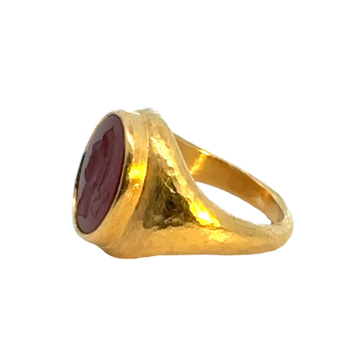 | 22K Hammered Yellow Gold, Carnelian Stone, bright orange-red color, hand carved, back side of ring is closed, size 7 |