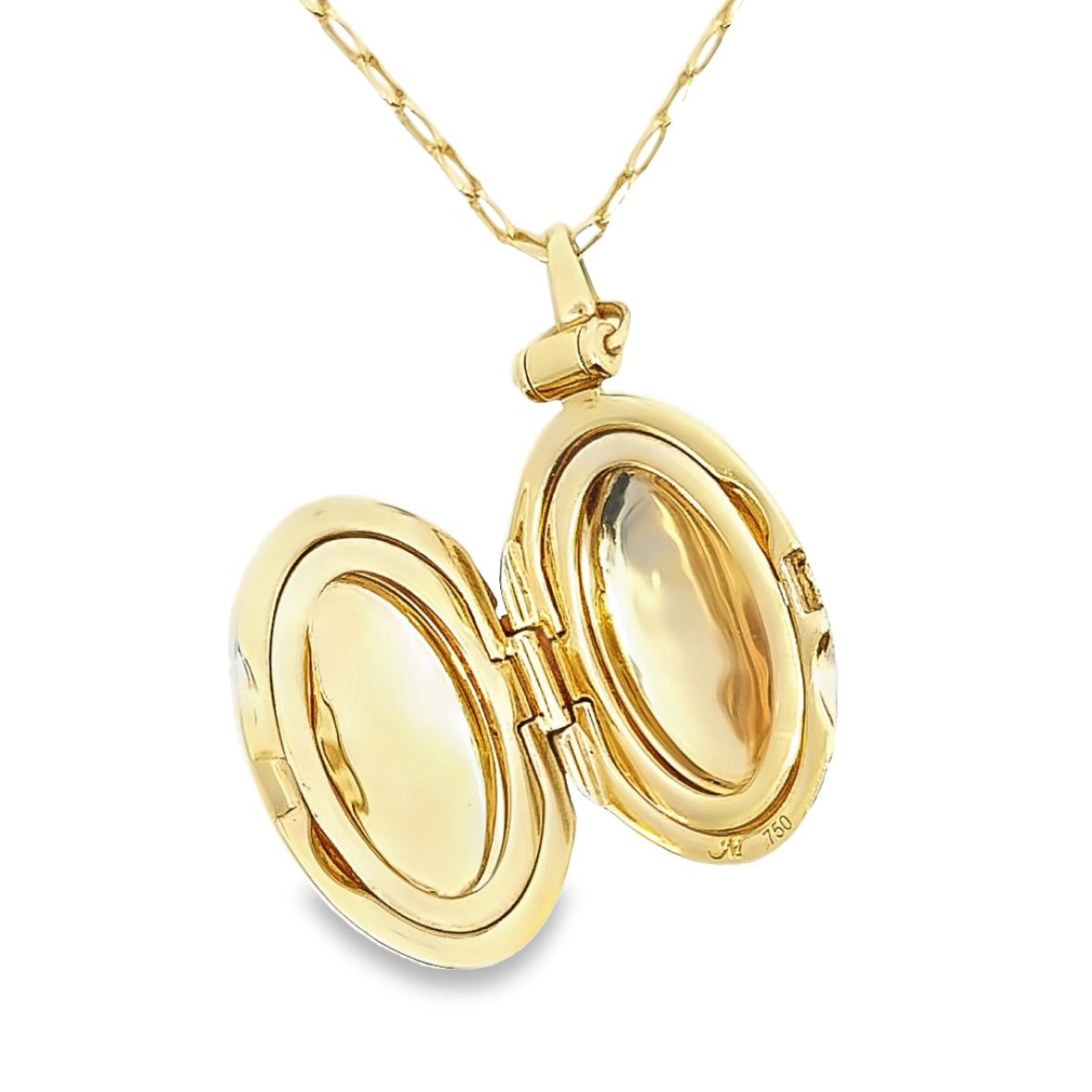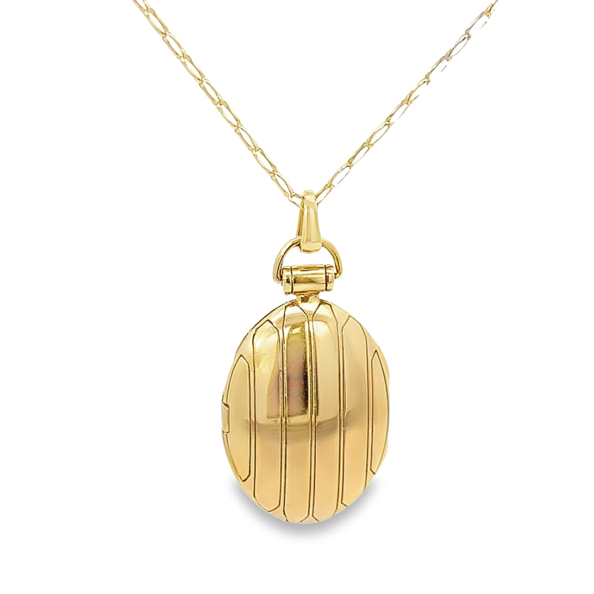 | 18K Yellow Gold, Oval Locket, Fits 2 Pictures, Chain 29”, Lobster Claw Clasp |