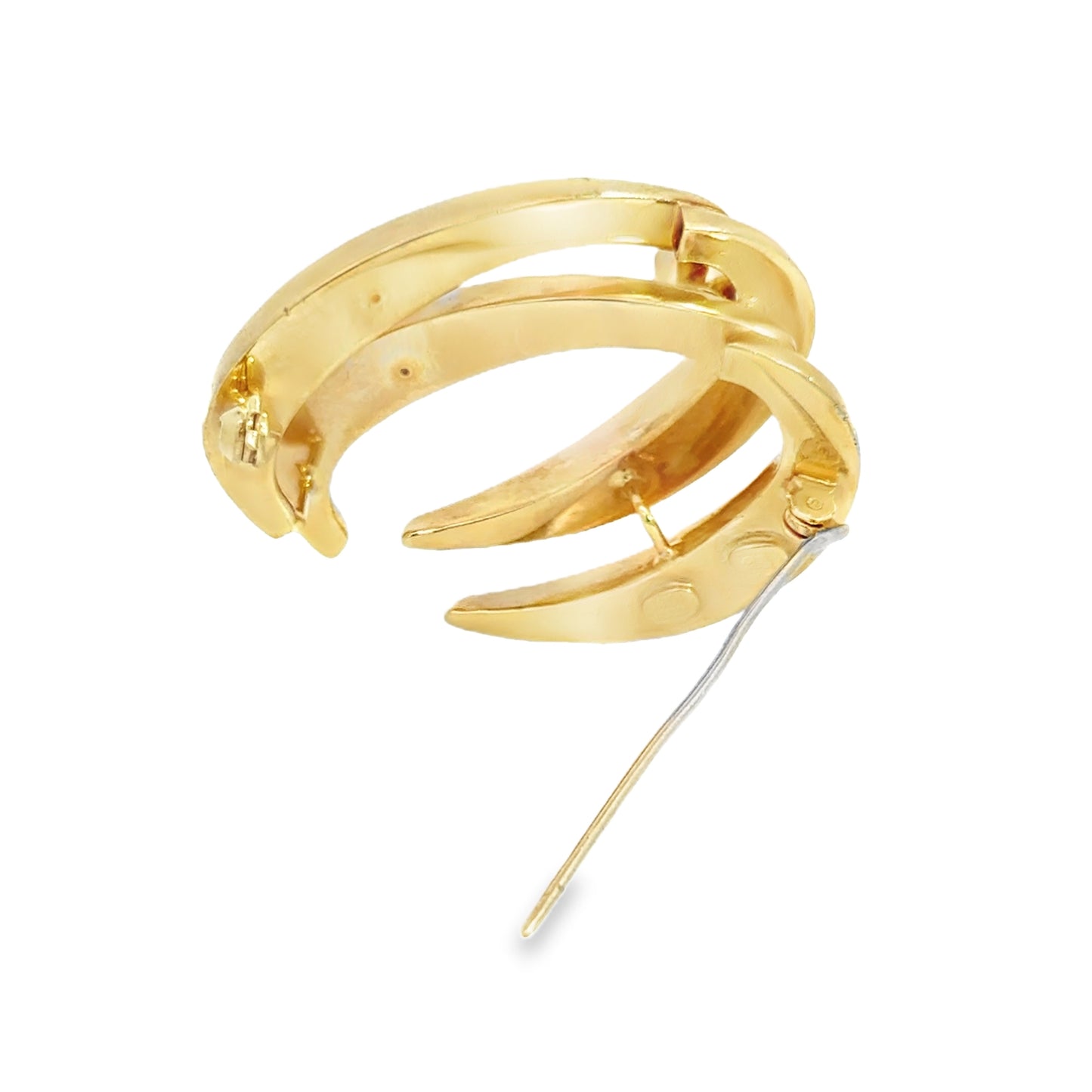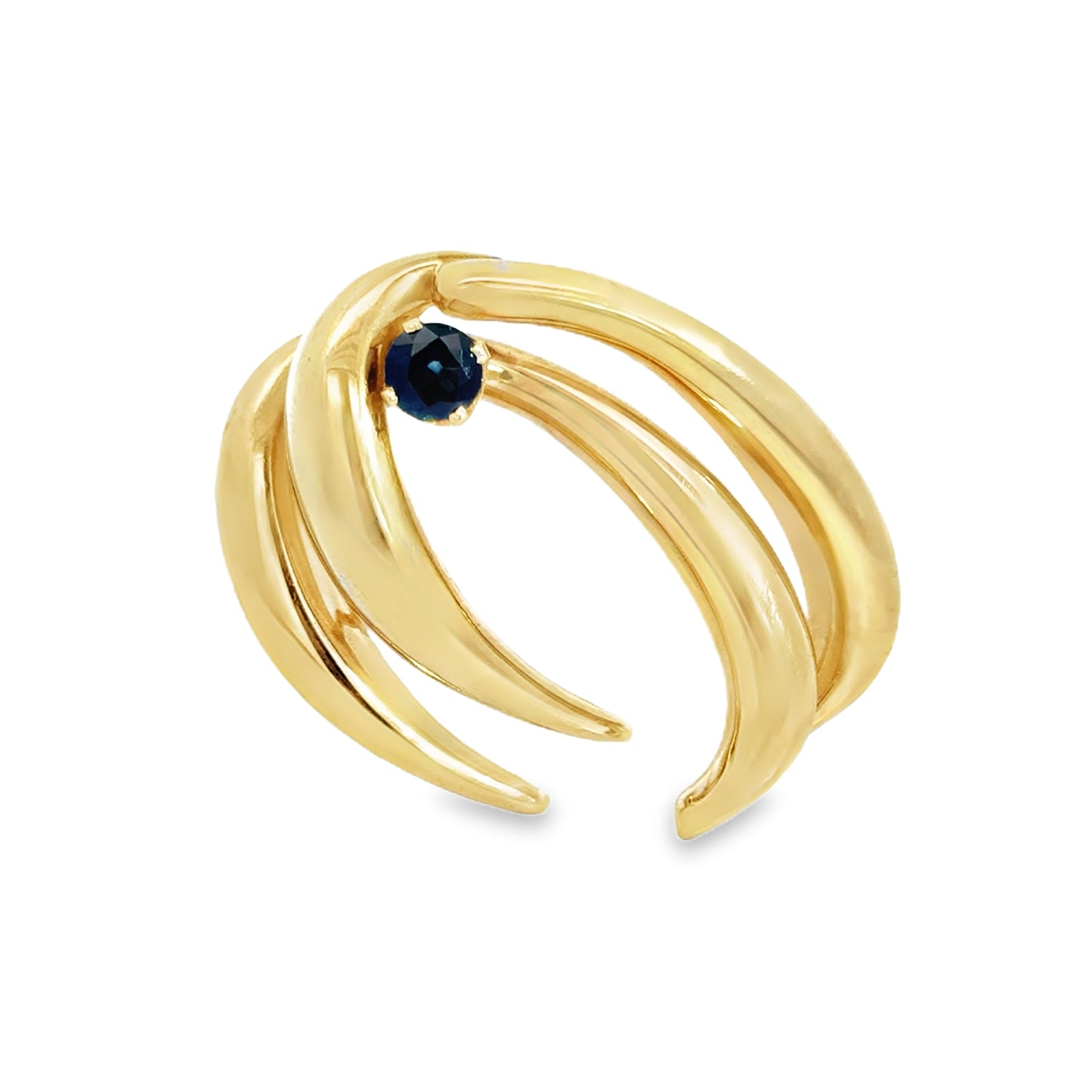 This is a unique brooch crafted in 14k yellow gold, featuring an abstract design with flowing, curved elements that create a sense of movement. At its center, it is set with a faceted blue sapphire, which adds a striking contrast to the warm tone of the gold. The brooch has a polished finish, enhancing its elegant and modern aesthetic. Its versatile design makes it a standout accessory, ideal for wearing on a lapel or as a decorative accent on clothing. The secure pin mechanism at the back ensures easy and safe wear.