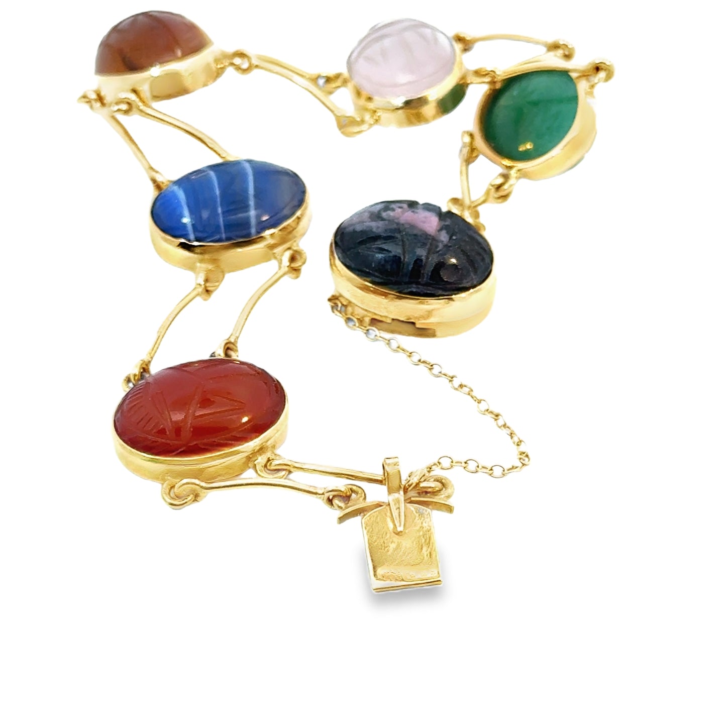 This vibrant bracelet is crafted from 14k yellow gold and features an array of colorful cabochon-cut gemstones, creating a dynamic and eye-catching design. The bracelet is composed of oval-shaped stones, each bezel-set in polished gold frames, linked together by delicate gold connectors. The colorful stones offer a variety of rich hues and textures.