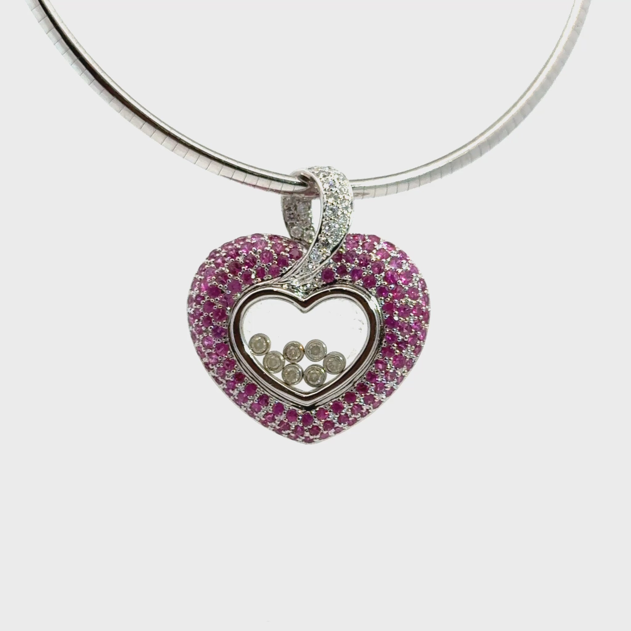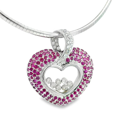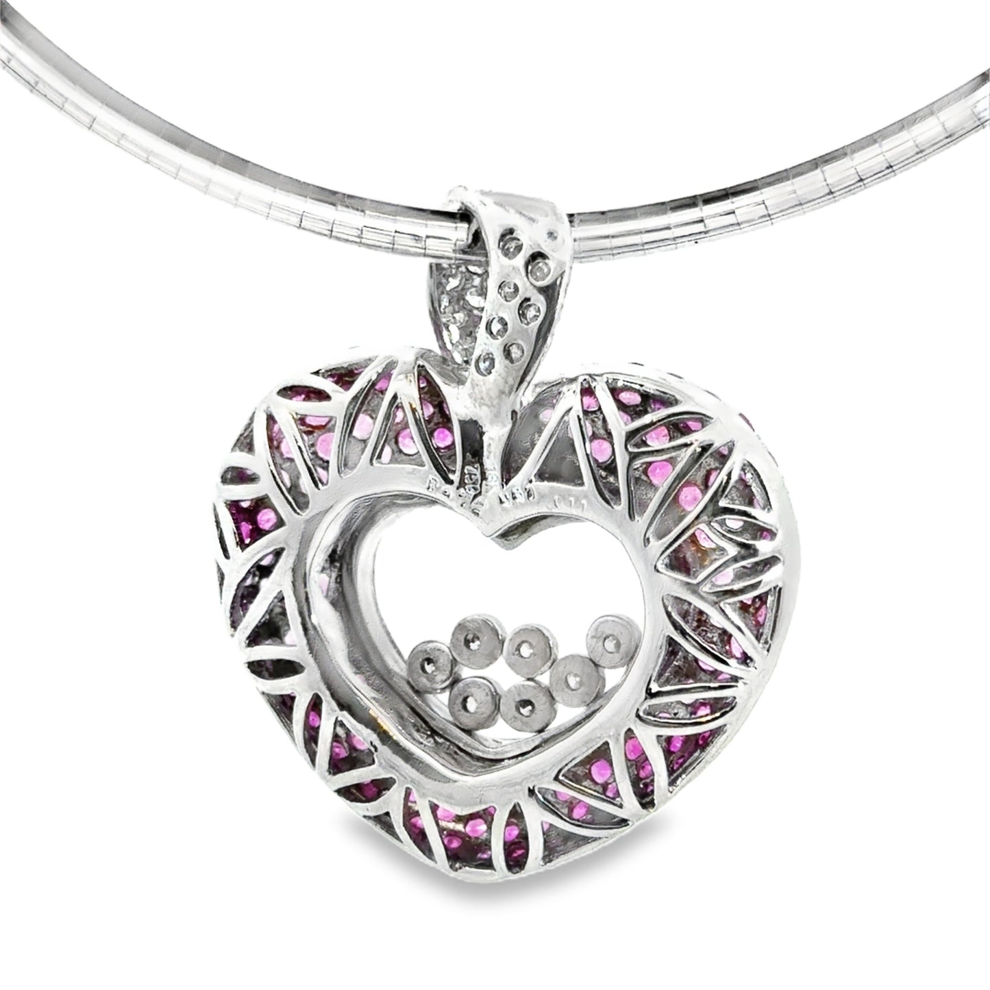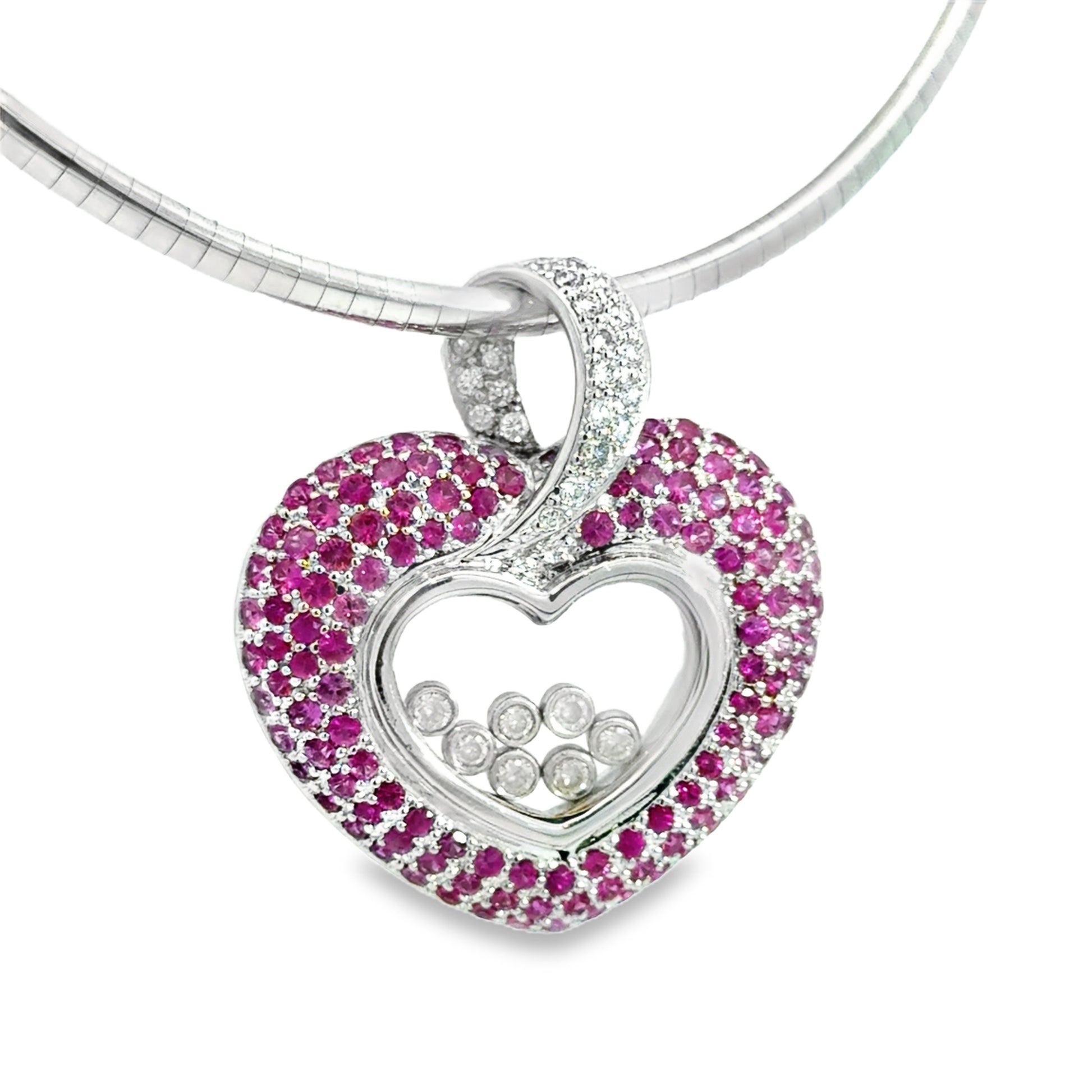 18K White Gold Heart Pendant with Pink Sapphires & Floating Diamonds – Chopard Style