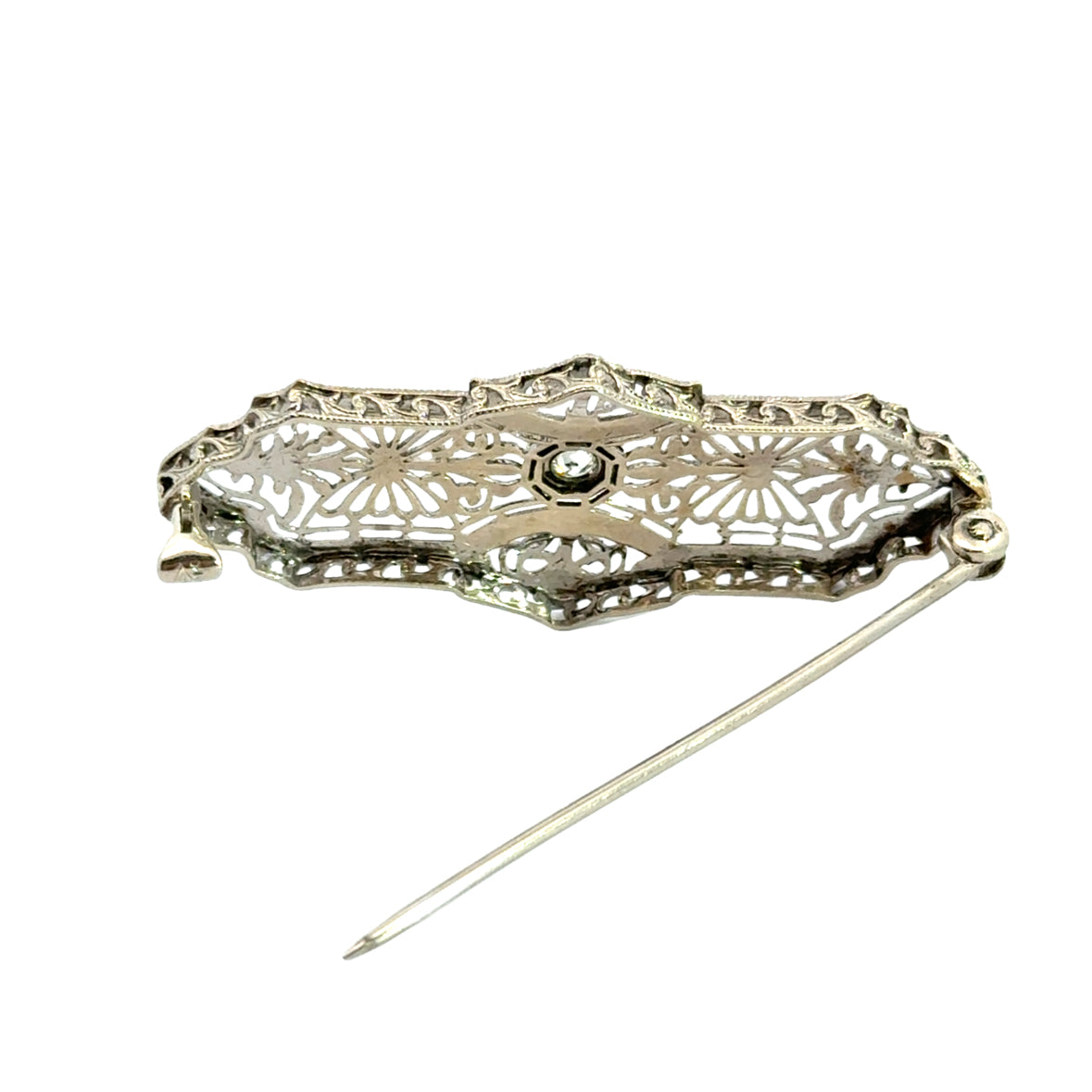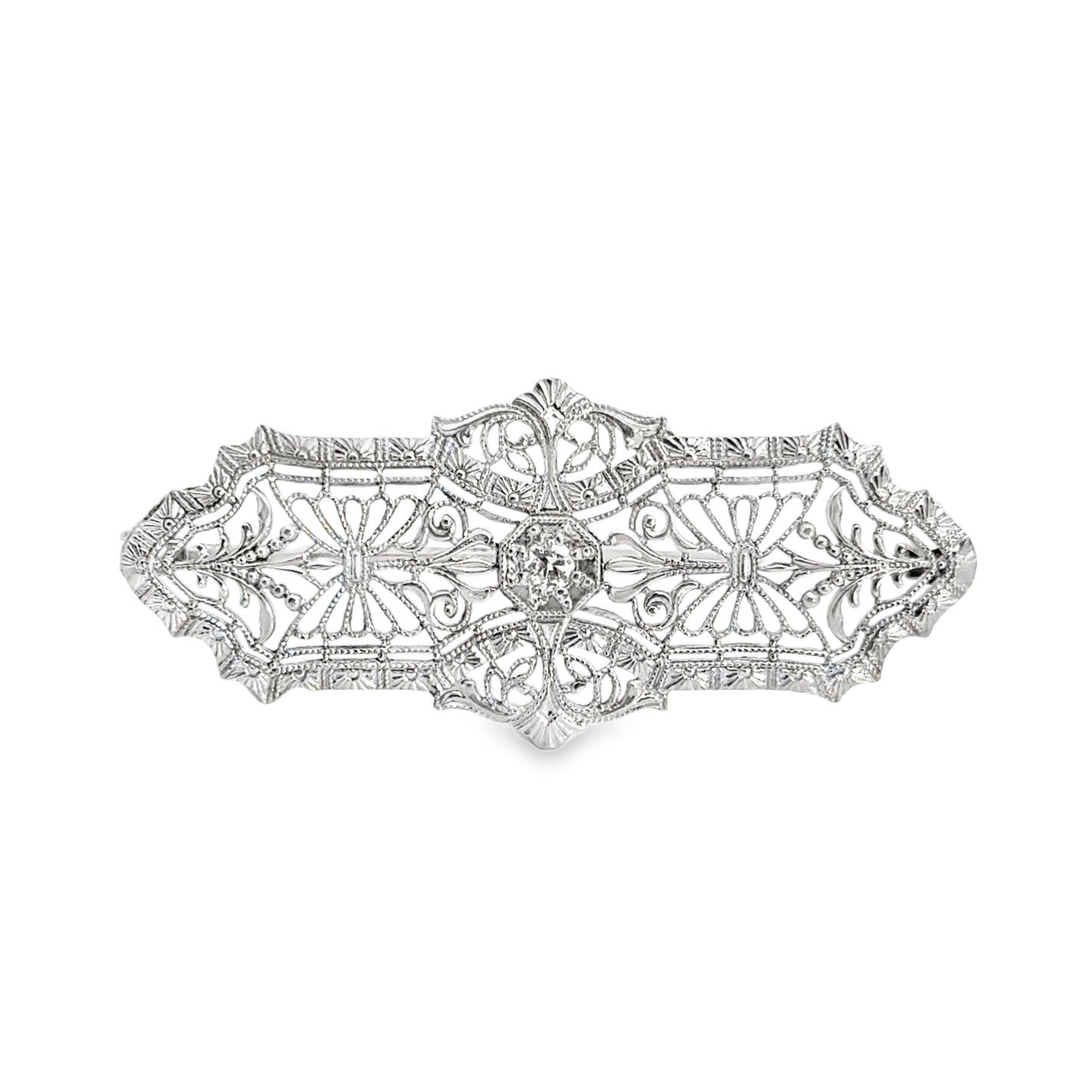 This exquisite 1920s Art Deco bar pin is crafted in 14K white gold, showcasing an elaborate filigree design with delicate openwork patterns. The symmetrical, floral-inspired motifs and finely detailed milgrain edging reflect the refined craftsmanship of the Art Deco era.