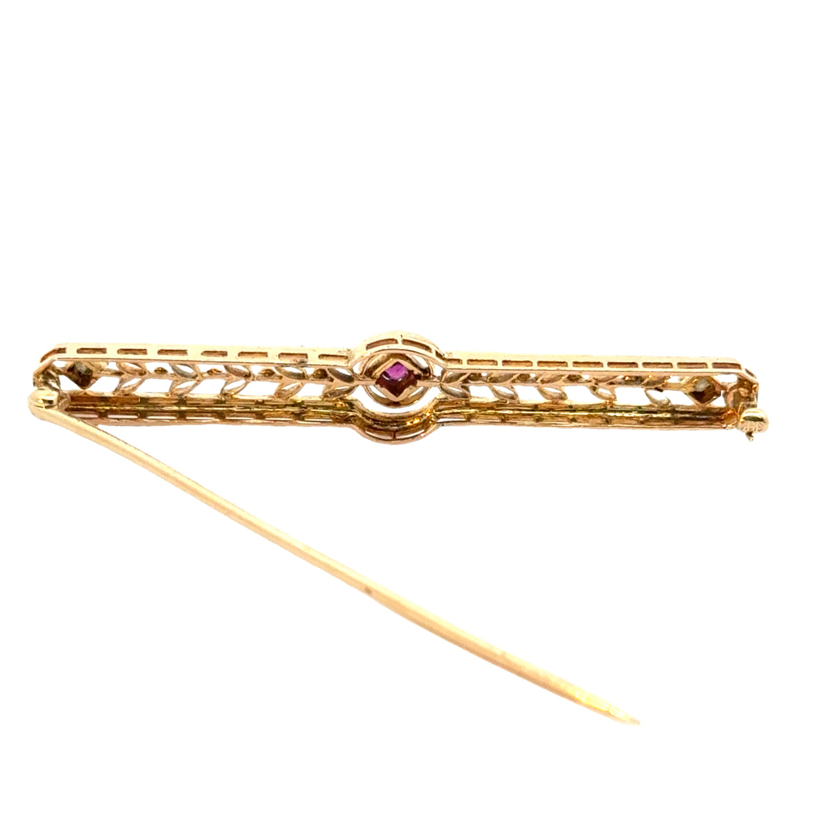 Retro 14K Yellow Gold Ruby & Seed Pearls Bar Pin