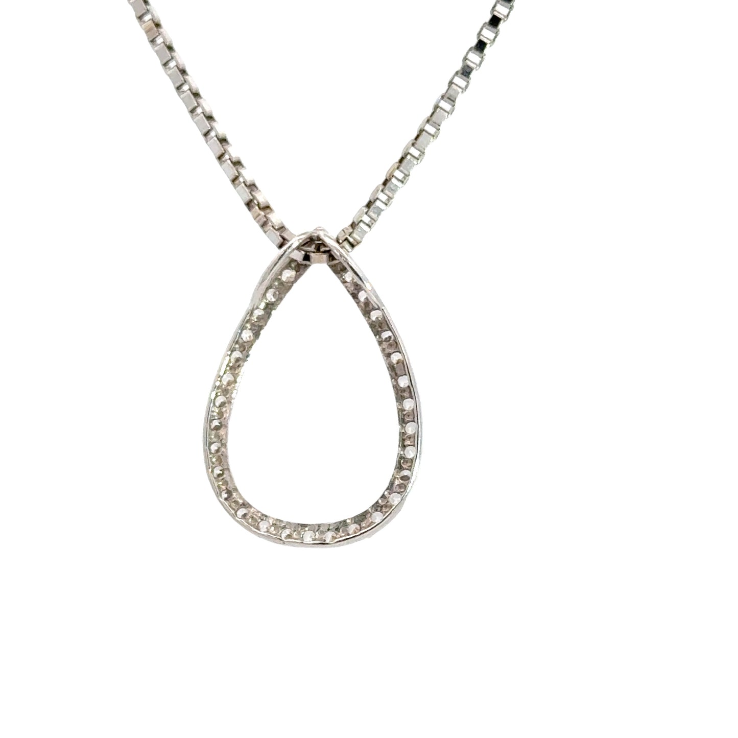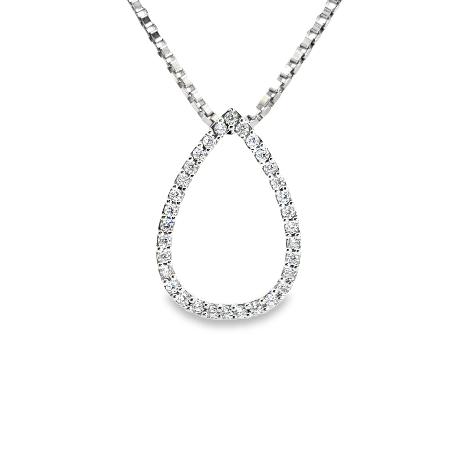 This elegant teardrop necklace boasts a delicate design encrusted with sparkling diamonds, making it the perfect accessory for any sophisticated outfit. The exquisite craftsmanship and timeless beauty of this pendant ensures that it will be cherished for years to come.