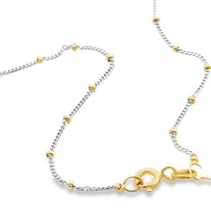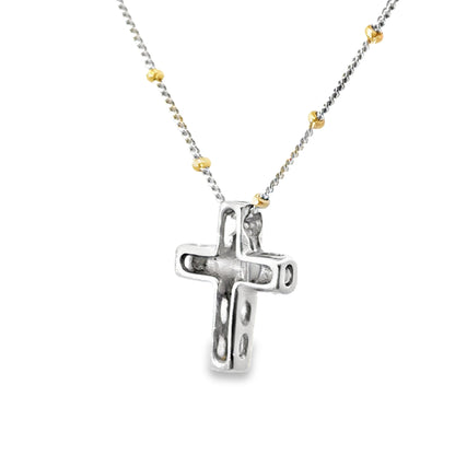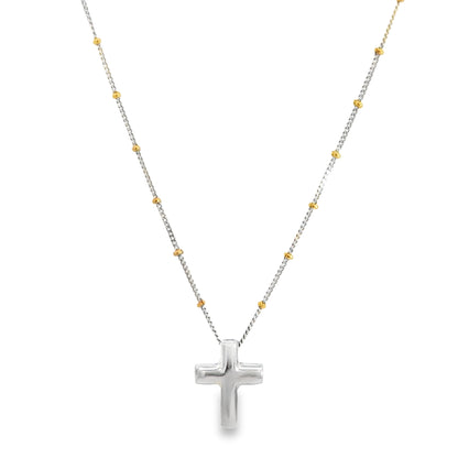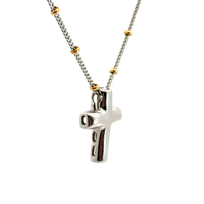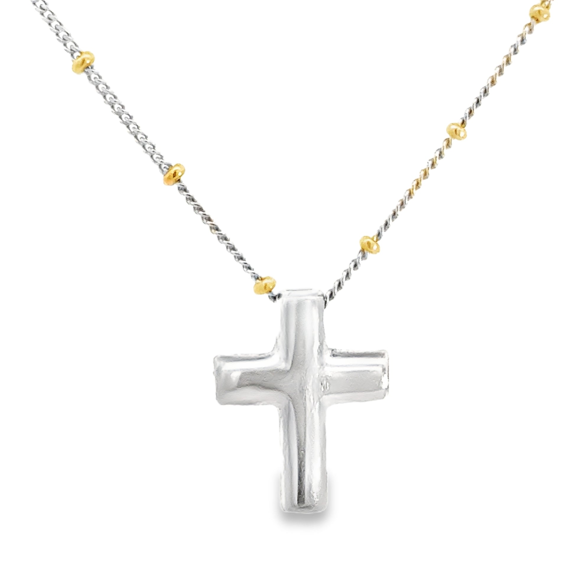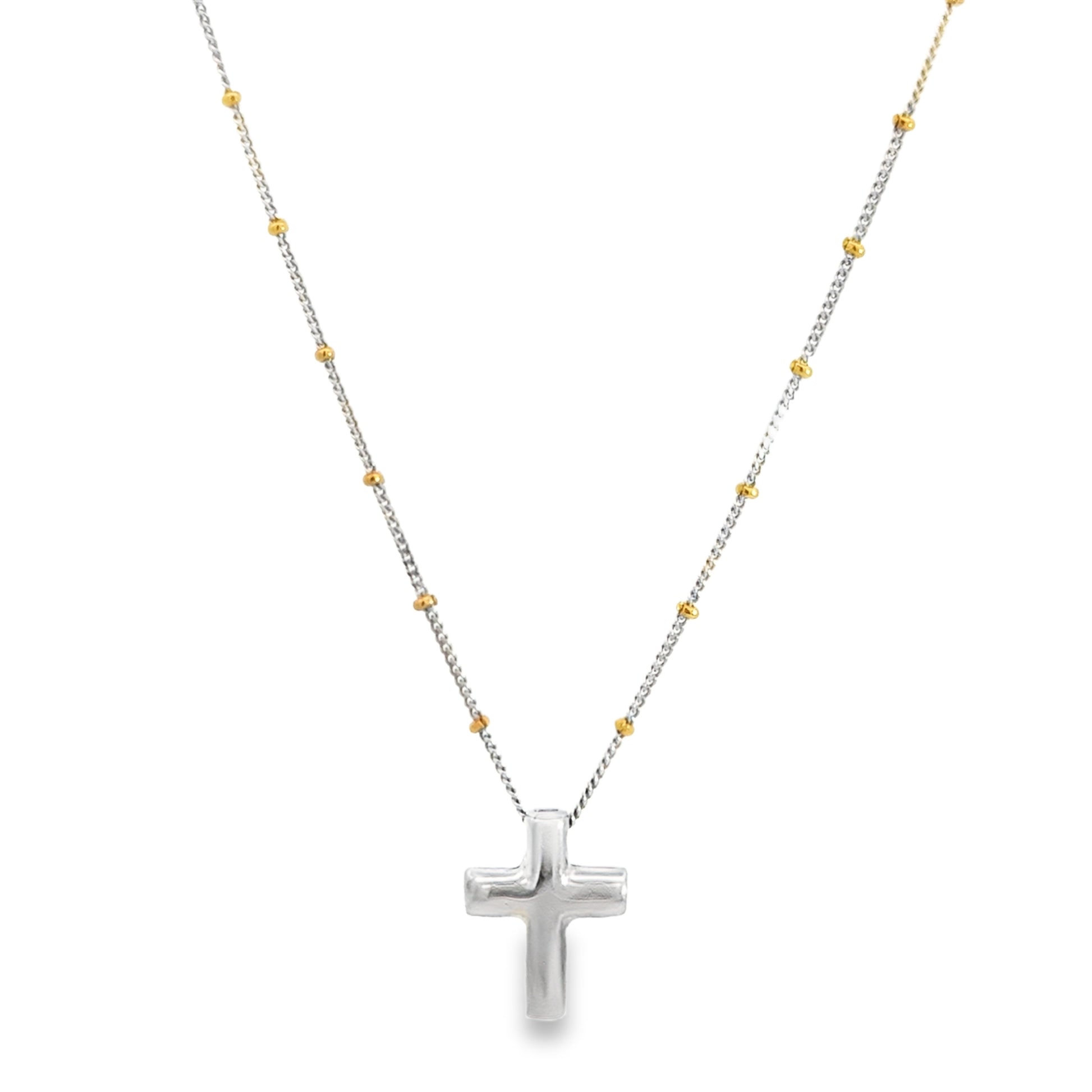 Sleek and meaningful, this 18K two-tone gold necklace features a polished white gold cross pendant suspended from a unique chain adorned with yellow gold bead accents. The combination of high-shine white and warm yellow gold creates a striking contrast that enhances the design’s modern elegance. Ideal for everyday wear or as a thoughtful gift, this piece balances simplicity with sophistication. A beautiful and unique piece. Chain included.