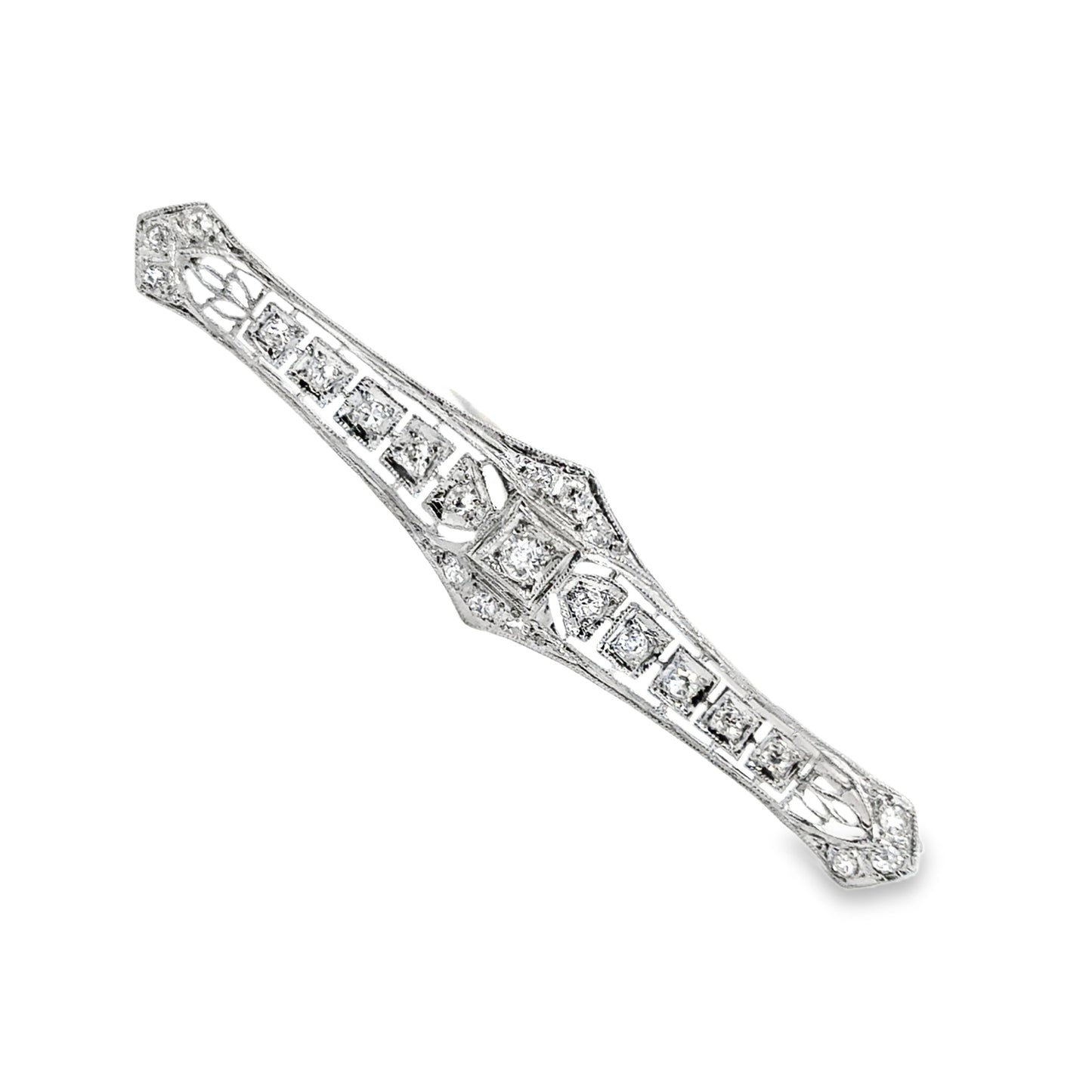 At the center, a square-cut diamond is bezel-set, flanked by a series of graduated round diamonds, each set in individual milgrain-accented frames. The diamonds sparkle beautifully against the platinum backdrop, creating a dazzling effect. The pin tapers gently at the ends, with additional diamond accents and fine latticework completing the symmetrical design.