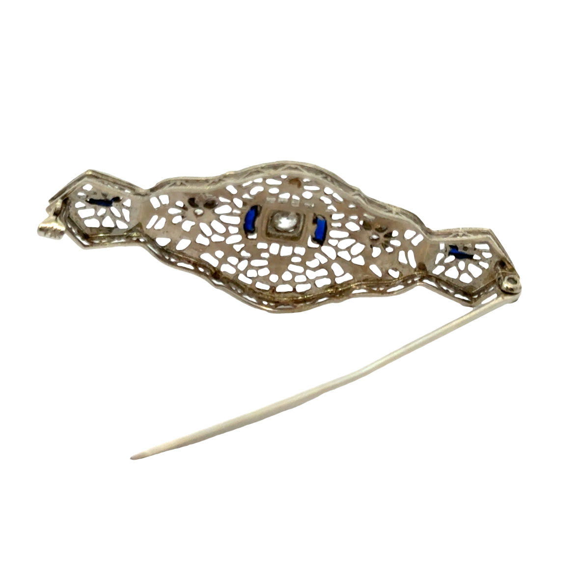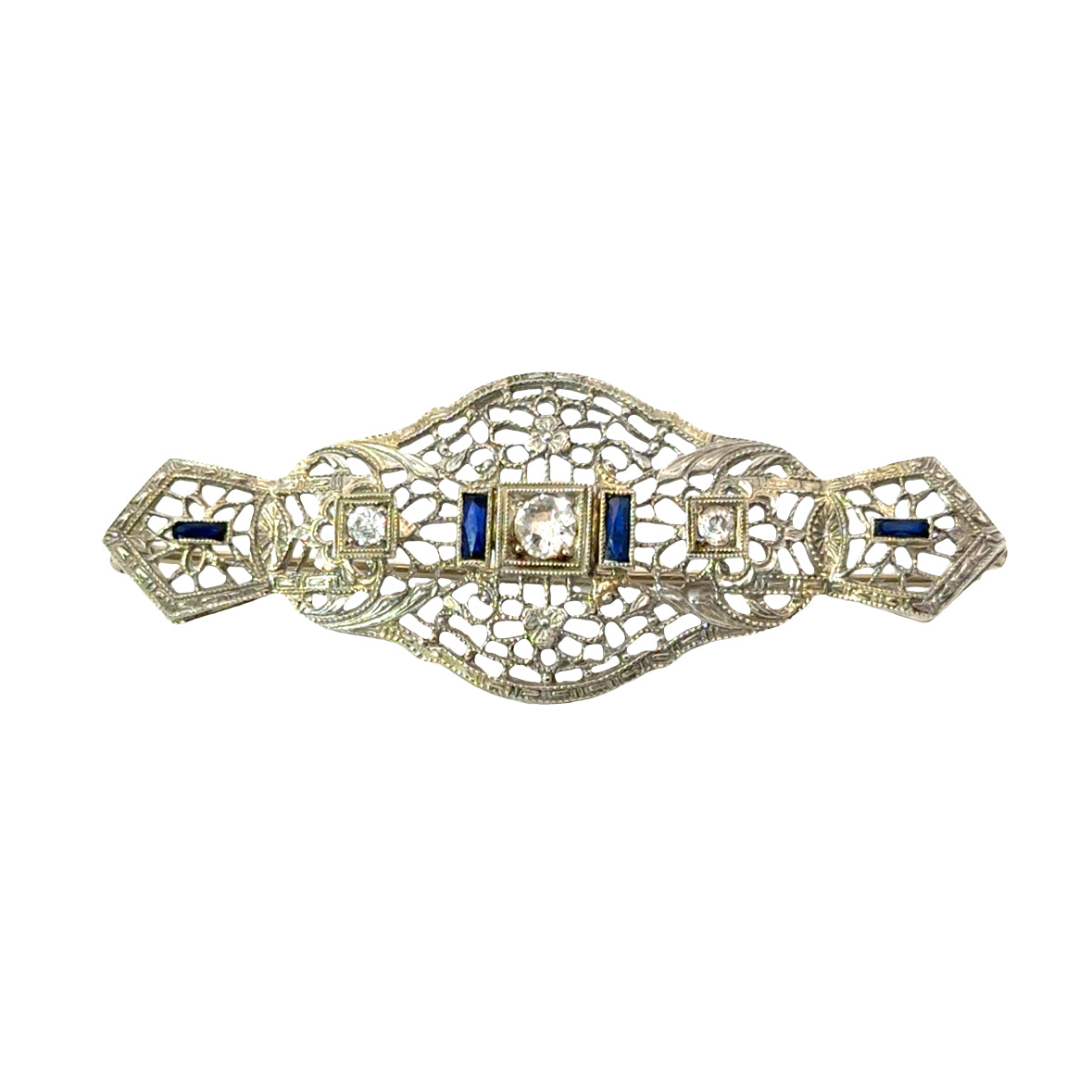 Antique 14K White Gold Filigree Bar Pin with Diamonds and Sapphires