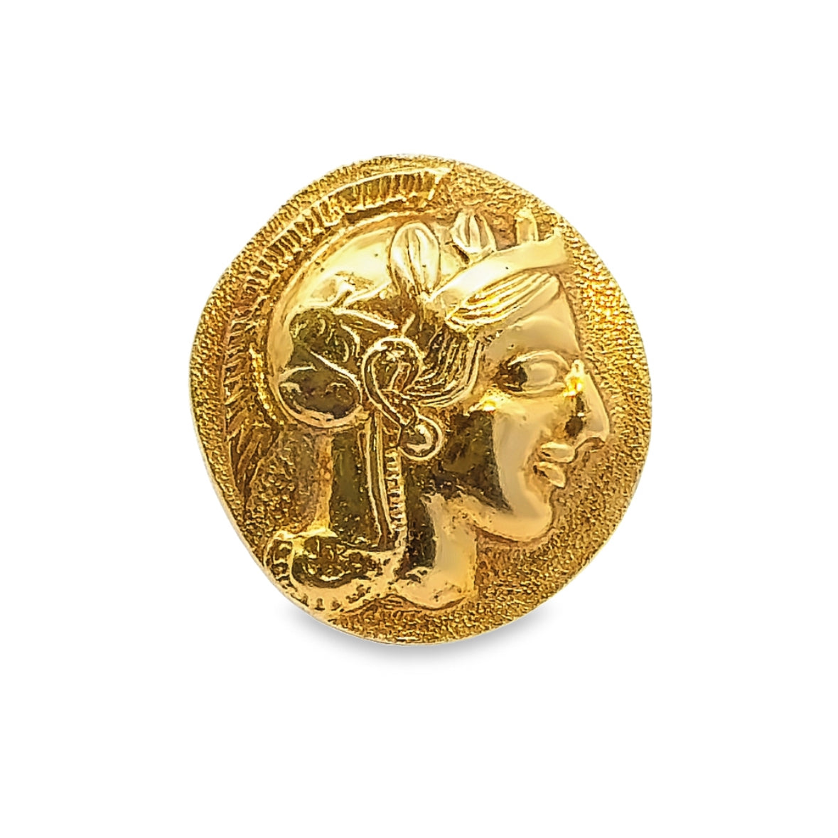 | 18K Solid Yellow Gold, Ancient Greek Figure, Disk Size Approx. 23x24mm, Size 9.5 |